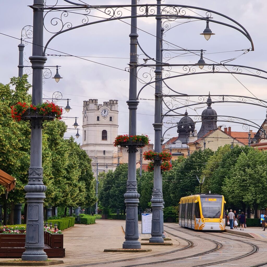 (Debrecen fő utcája: a Piac utca a Nagytemplommal és a villamos hálózat egy szép részlete.)