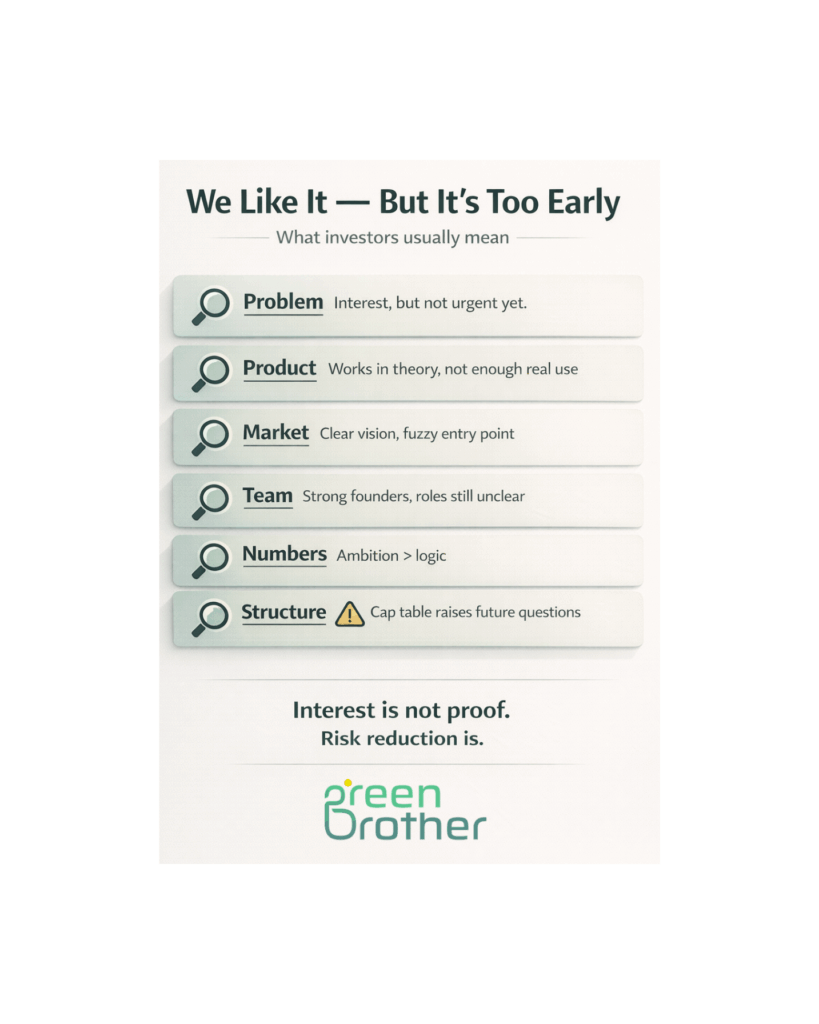 This phrase usually means interest without readiness. The investor sees potential. They just don’t see enough risk reduced yetUnderstanding what sits behind this feedback can save founders months of frustration — and help them come back stronger.
